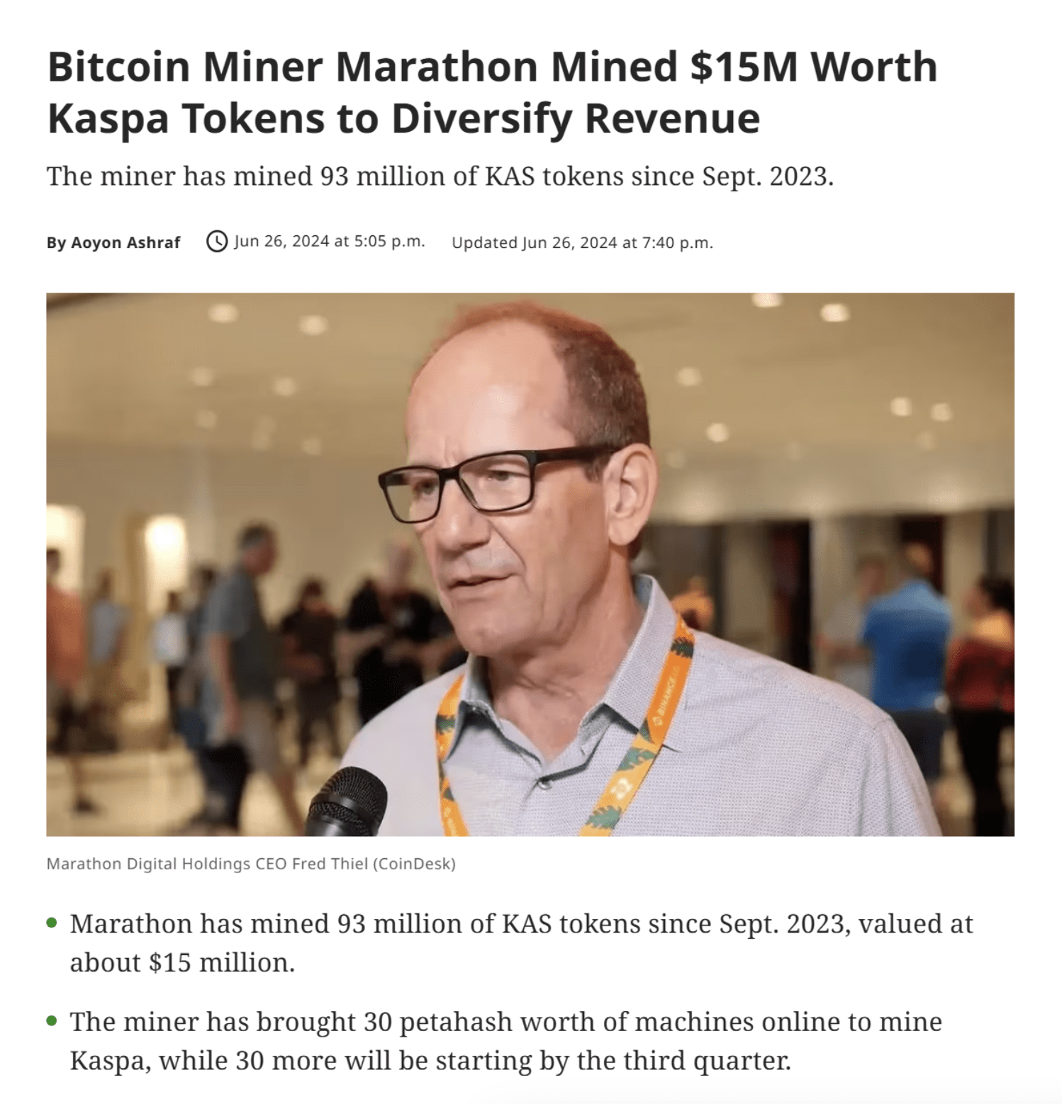“By mining Kaspa, we are able to create a stream of revenue that is diversified from Bitcoin, and that is directly tied to our core competencies in digital asset compute,” said Adam Swick, Marathon’s chief growth officer in the statement.