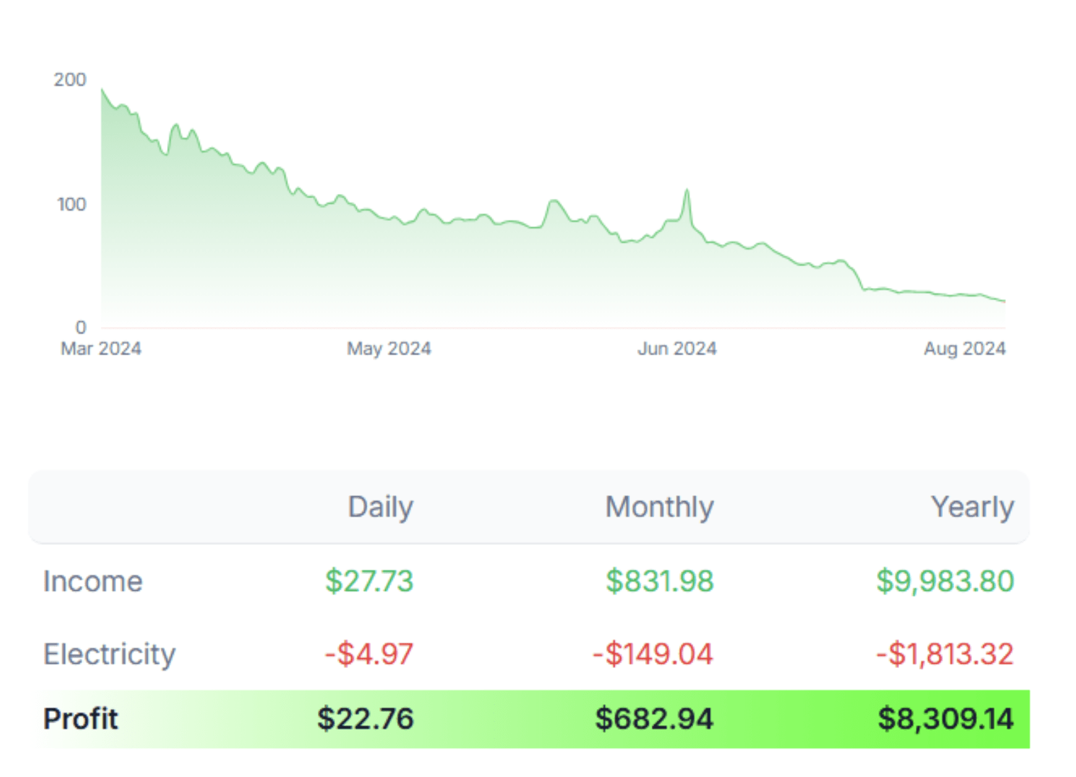 The $0.069 kWh with the power usage of the KS5 at 3000W translates to an all-in hosting fee of $1,813.32 a year or $149.04 monthly. At the moment of writing this article that provides a monthly profit of $682.94 and an ROI of just XX Months which is faster than the ROI of Bitcoin ASIC Miners in current market conditions.
